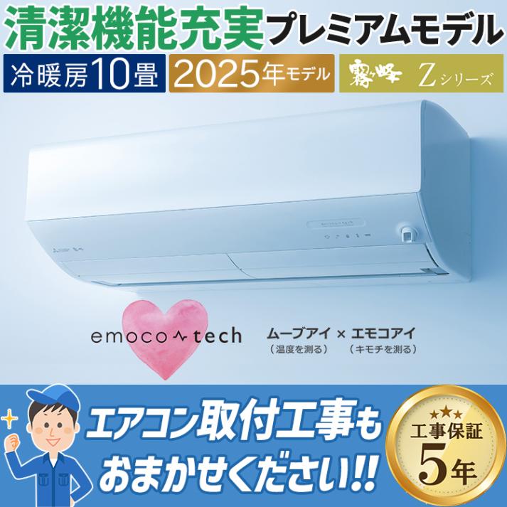 東京 神奈川地域限定 標準取付工事費込 エアコン同配 主に10畳用 三菱電機 Zシリーズ 2025年 冷暖房 省エネ 空気清浄 100V MSZ-ZXV2825-W-TK