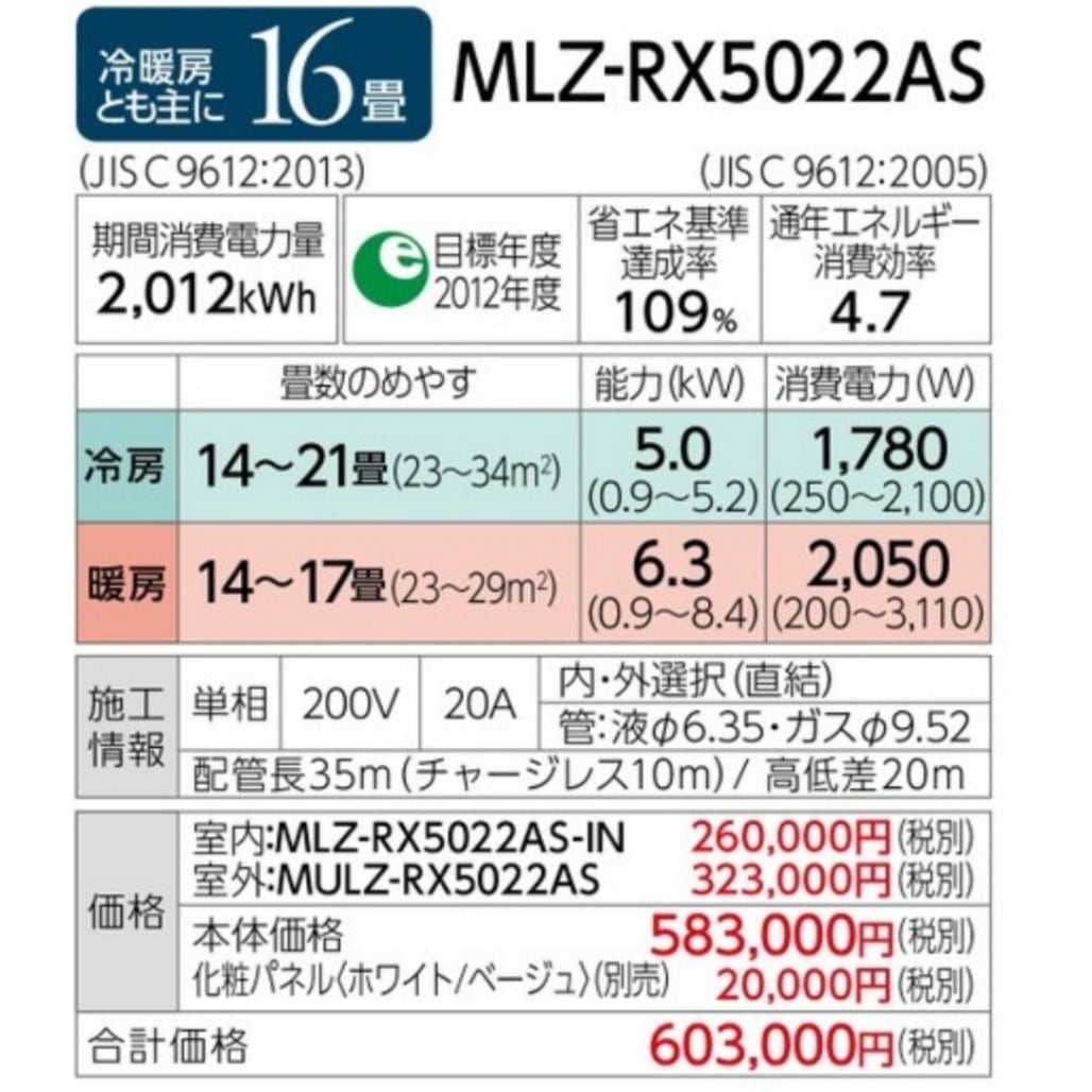 MLZ-GX5022AS※ 三菱電機ハウジングエアコン 室内機・室外機・パネルセット 1方向天井カセット形 GXシリーズ 主に16畳 霧ヶ峰 冷暖房