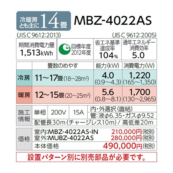 MLZ-RX3622AS※ 三菱電機ハウジングエアコン 室内機・室外機・パネルセット 1方向天井カセット形 RXシリーズ 主に12畳 霧ヶ峰 冷暖房