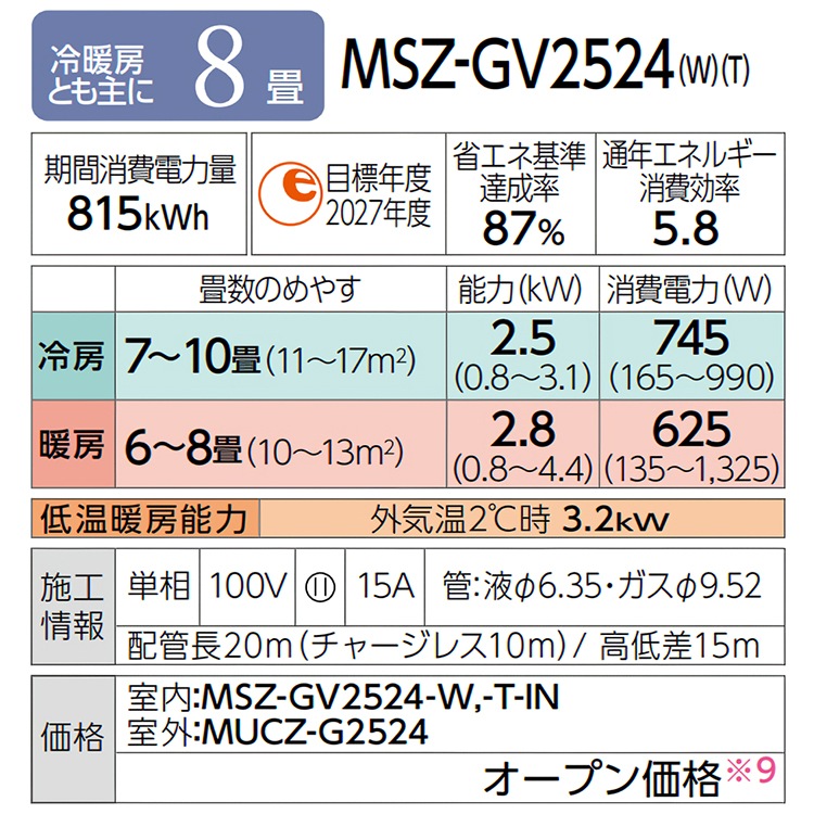 東京 神奈川地域限定 標準取付工事費込 エアコン同配 おもに6畳 三菱電機 霧ヶ峰 GVシリーズ 2024年 3モード除湿 単相100V MSZ-GV2224-W-TK